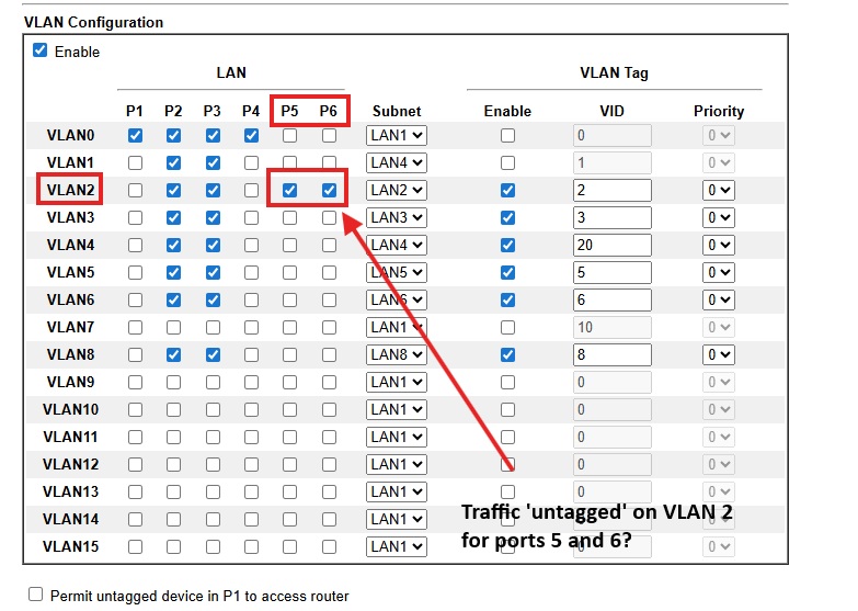 I have a a Vigor 2927 with a number of VLANs on it. I've enabled WAN2/P6 and disabled the WAN setting so it acts as an additional ethernet port. I followed this guide: https://www.draytek.com/support/knowledge-base/7407