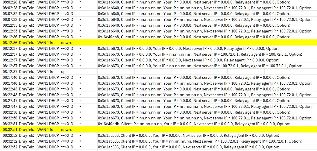When I look at the logs on the Draytek I can see that just before each drop it sends two DHCP requests.